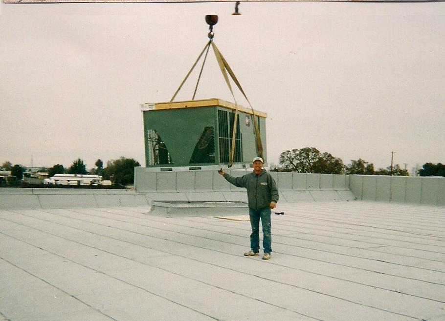 A young Rod Baker overseeing a major commercial rooftop HVAC installation — Baker’s has handled projects of all sizes for decades